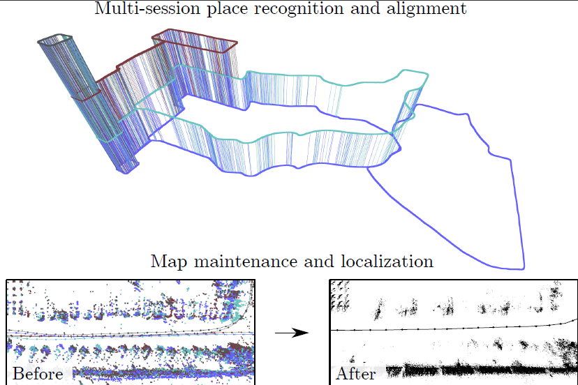 ![]() | Daniel Casado Herraez, Matthias Zeller, Dong Wang, Jens Behley, Michael Heidingsfeld, Cyrill Stachniss IEEE Robotics and Automation Letters (RA-L), 2026 paper |In our approach, we construct maps of coinciding areas and align them by performing place recognition between them. Additionally, our multi-sequence loop detection and verification strategy for radar sensors is able to filter incorrect loop matches enhancing trajectory alignment. Then, our novel map maintenance module handles radar noise and preserves persistent map points that remain reliable for localization. Subsequently, we estimate the robot poses in the resulting map by combining local odometry with scan-to-map matching, overcoming the complexities of sparse automotive radar data. |